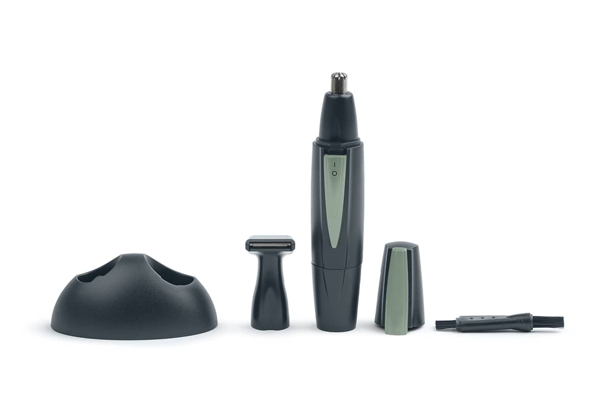 Nariz, patilhas e orelhas especiais. • Corte seguro e limpo. • Protegido contra projeções de água (IPX4): • Cabeça removível para limpeza fácil. • Luz integrada para visão ideal • Design leve e ergonômico. • Botão liga / desliga. • Acessórios incluídos: escova de limpeza e suporte de mesa. • Tampa protetora. • Funciona com 1 bateria "AA" de 1,5 V