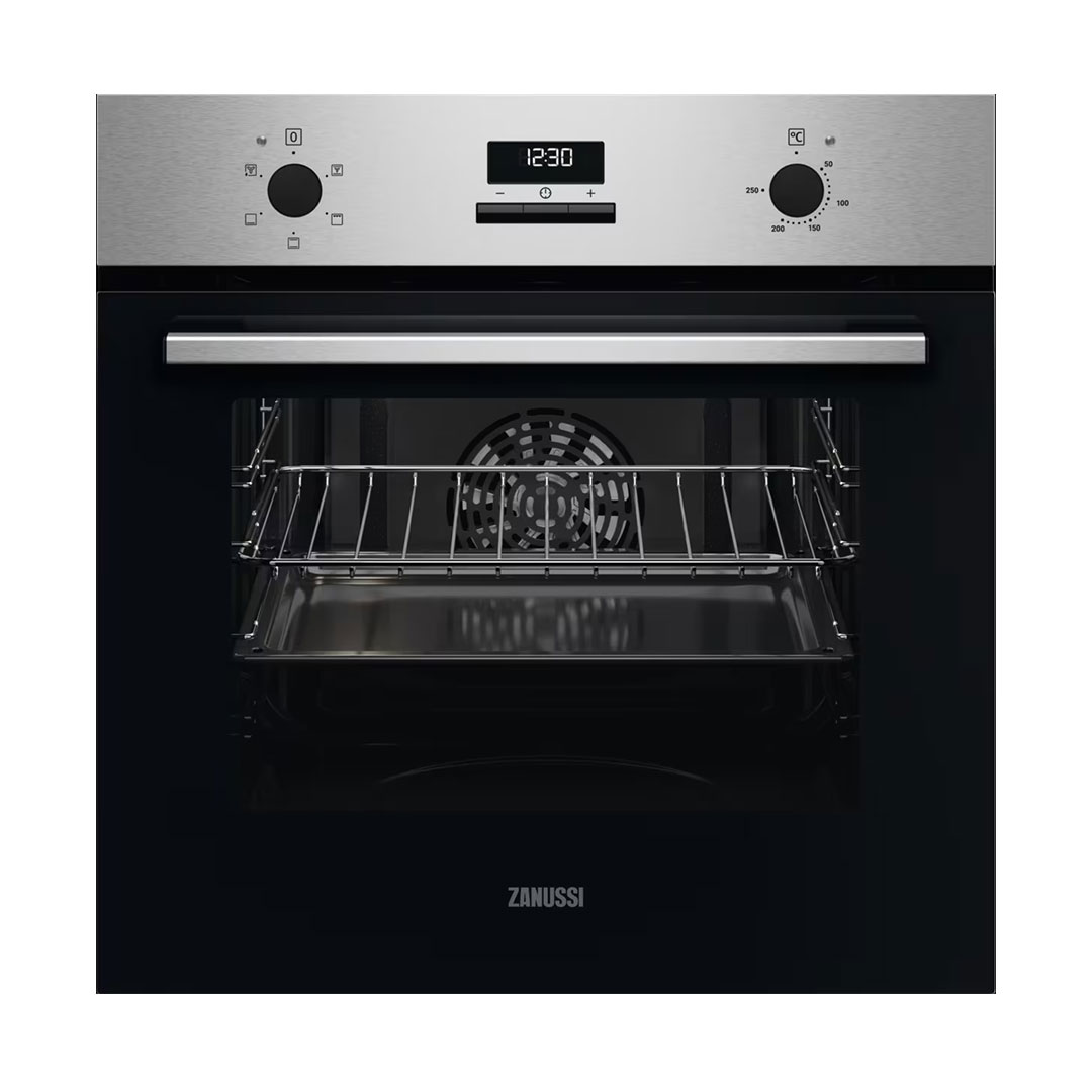 orno multifunções FanCook, ventilado, com botões escoamoteáveis, relógio eletrónico, função de limpeza Aqua Clean, inox anti dedadas, classe A