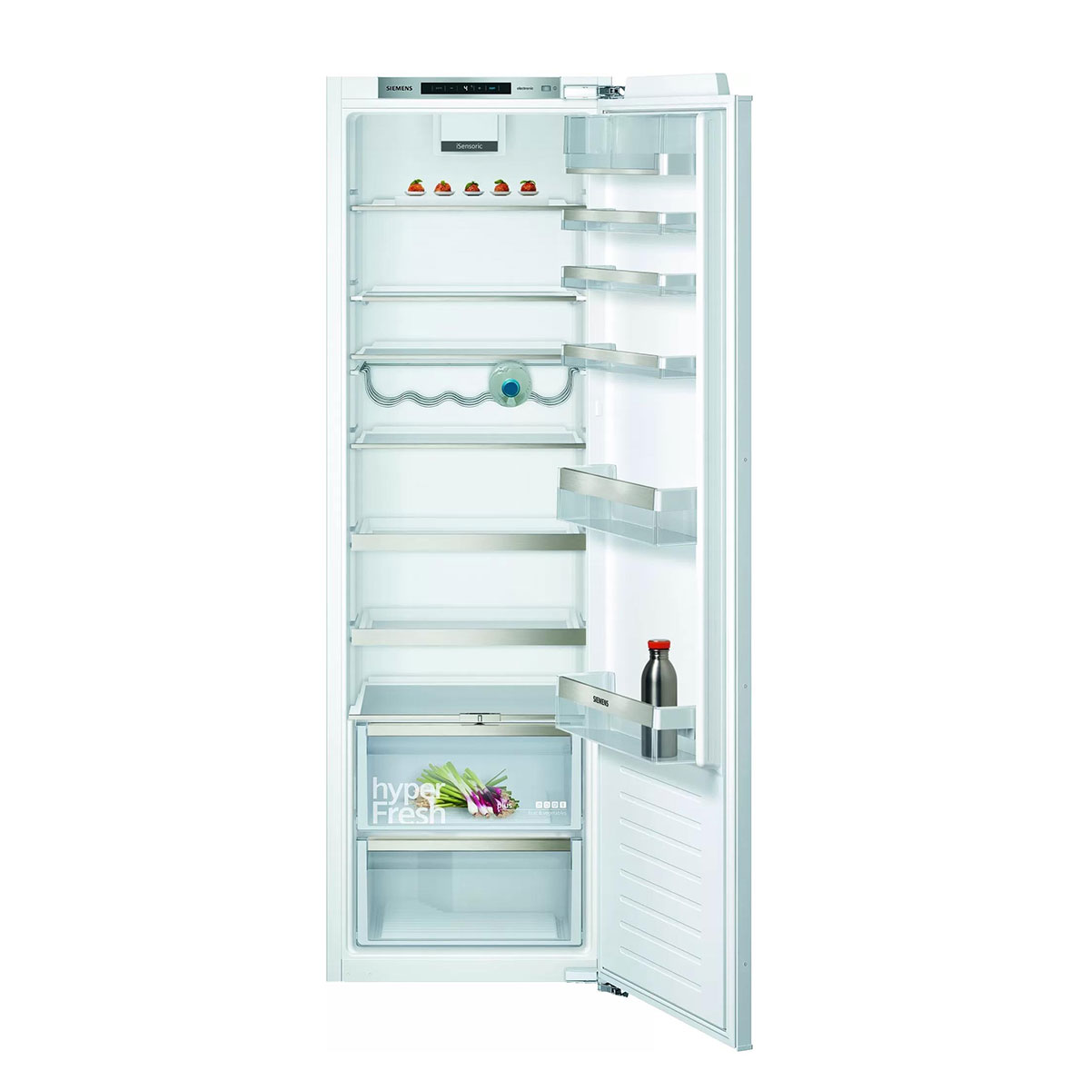IQ500, Frigorífico integrável Ventilado, 177,2 x 55,8 x 54,5 cm, Porta Fixa, 319 litros, E, 115 kWh, 37 dB, SN-T, 1 gaveta hyperFresh plus, 1 gaveta adicional, Visor Digital, Alarme sonoro de porta aberta, Super refrigeração, Iluminação LED, Suporte cromado para garrafas, Conjunto SBS com GI81NAE30