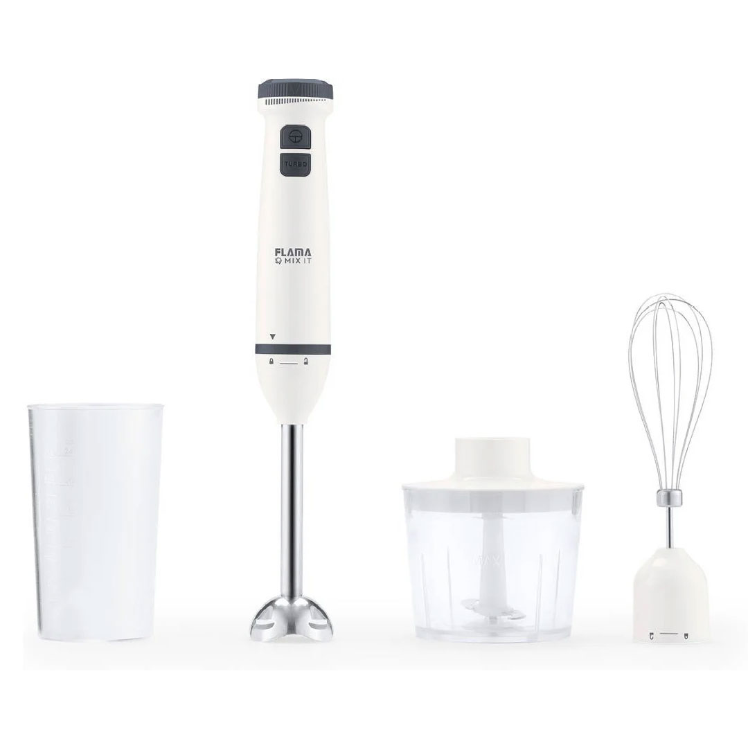 Potência 800W 2 velocidades Regulação de potência Pé metálico desmontável Lâminas Aço• Acessórios – batedor, picadora, copo c/ tampa"