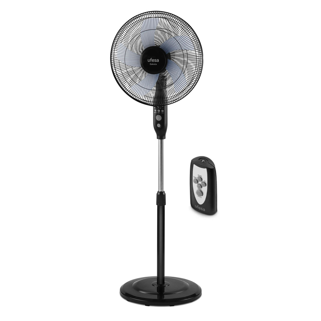 40cm de diâmetro. ULTRAFRESH 5, com 5 hélices com maior fluxo de ar, constante e homogêneo. 3 velocidades Controlo remoto. 3 modos: Normal-Sono –Natural Temporizador eletrônico até 7h 30min Altura ajustável até 134cm